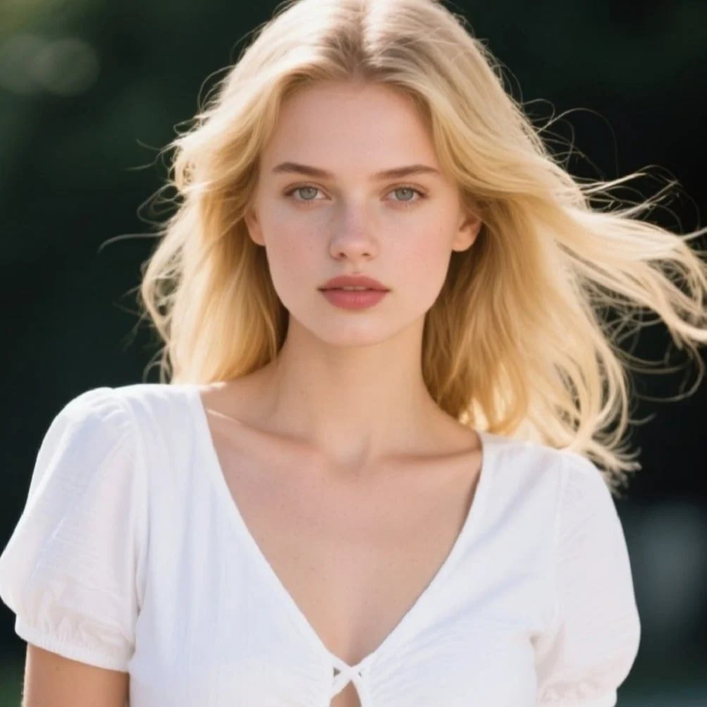 Prompt 2: Transform the uploaded portrait into a woman with curly long hair, wearing a summer dress, dreamy oil painting style, golden hour sunlight.