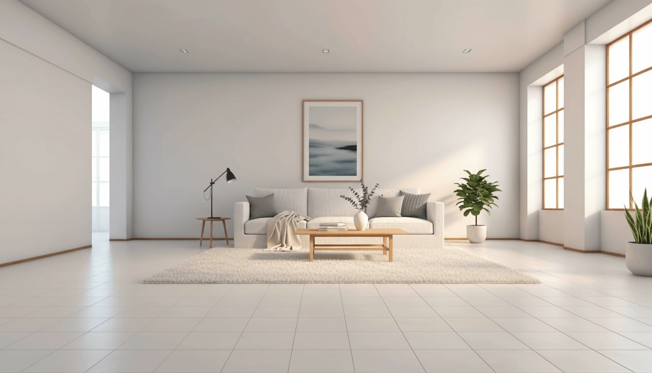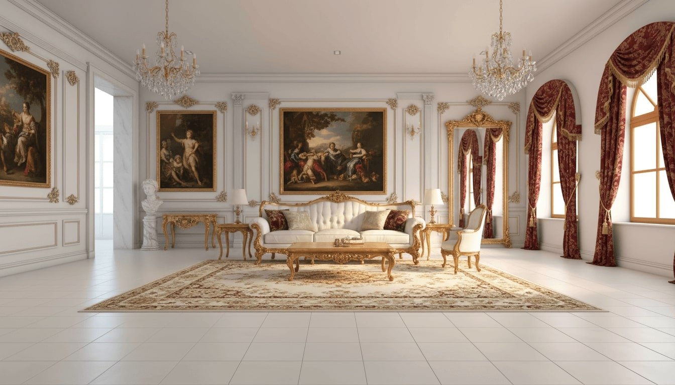 Prompt 1: Use the uploaded room photo to redesign it in luxury baroque style, white sofa, wooden table, photorealistic 3D render.