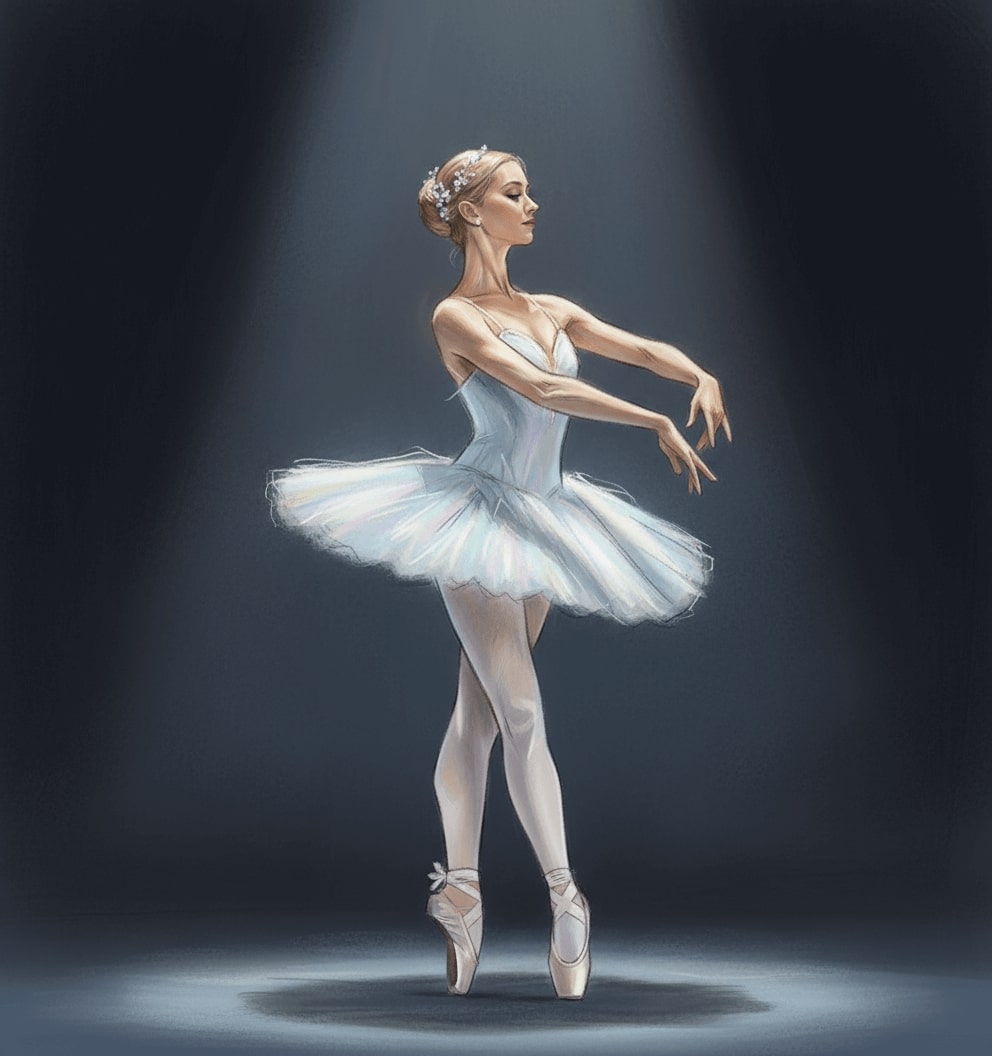 Prompt 1: Take the uploaded full-body photo and turn it into an elegant ballerina pose, painted in pastel sketch style with spotlight lighting.