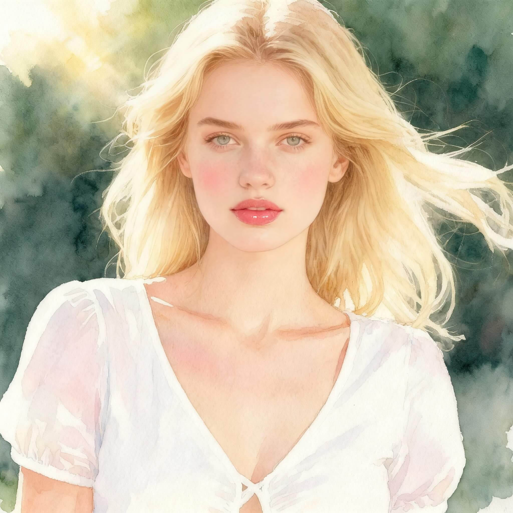Prompt 1: Use the uploaded photo to enhance the portrait with natural pink makeup, soft blush, and glossy lips, rendered in watercolor painting style with gentle morning sunlight.