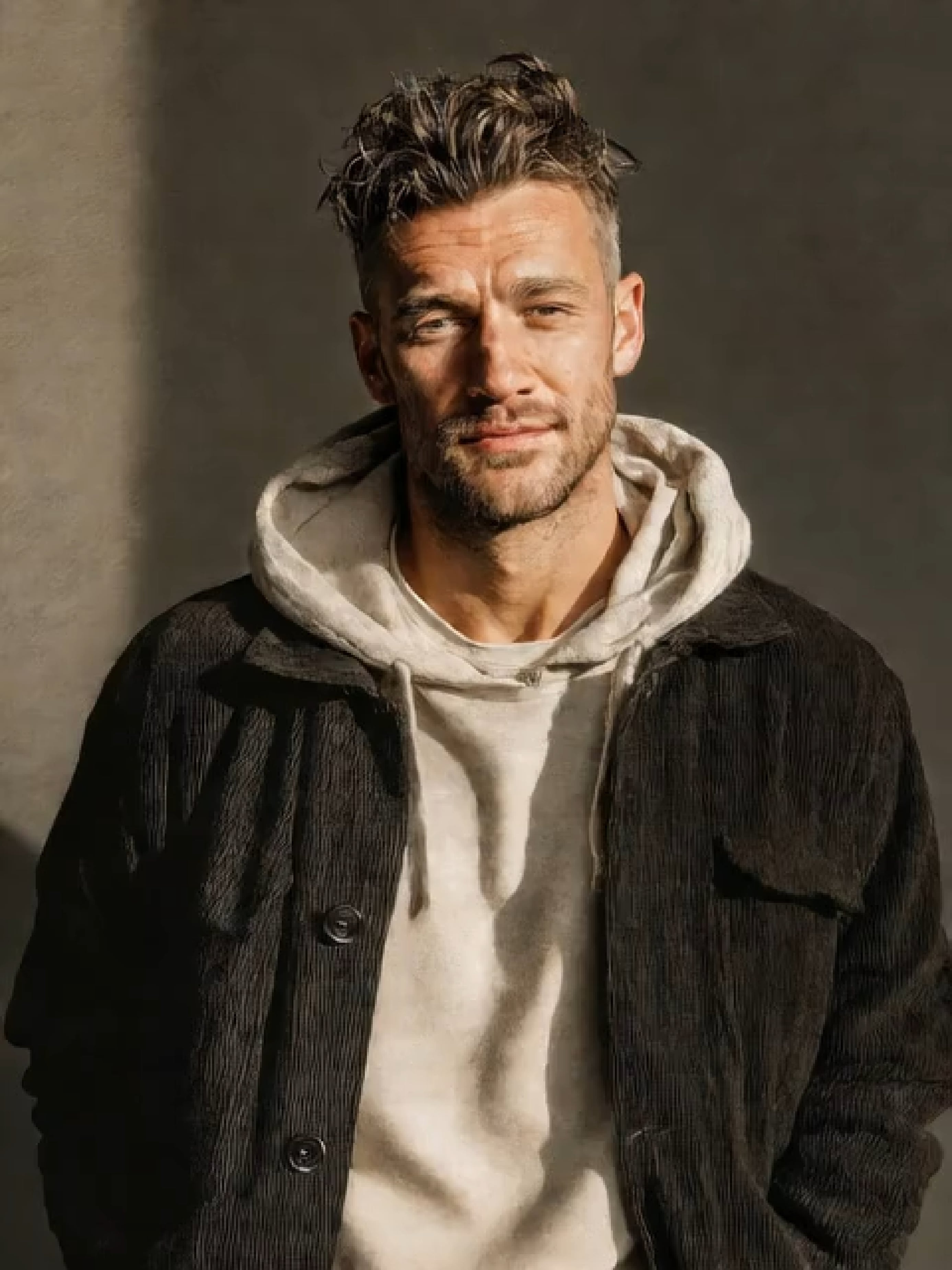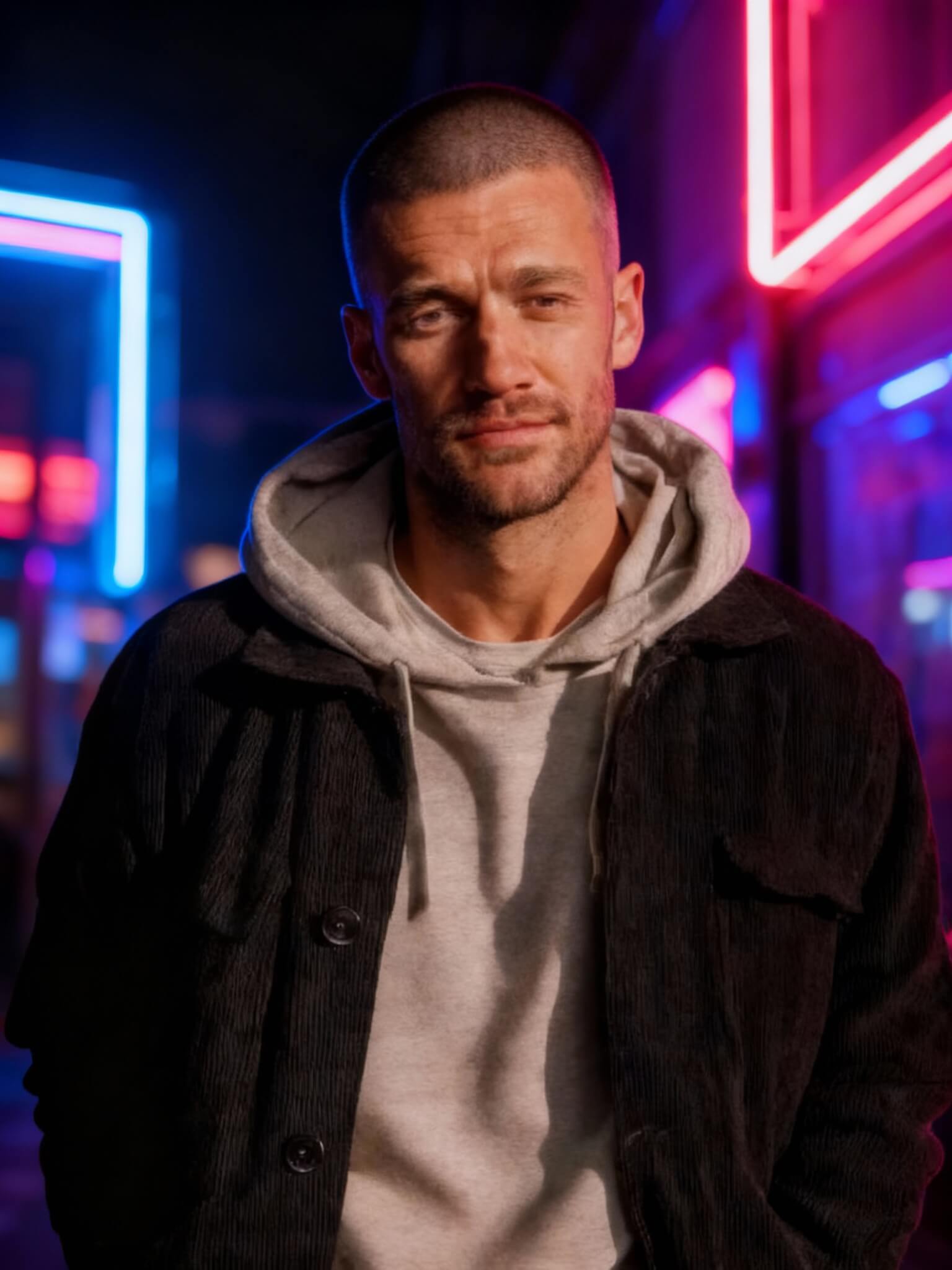Prompt 1: Use the uploaded headshot to change the hairstyle into a fresh buzz cut, cinematic street style, neon lights in the background.