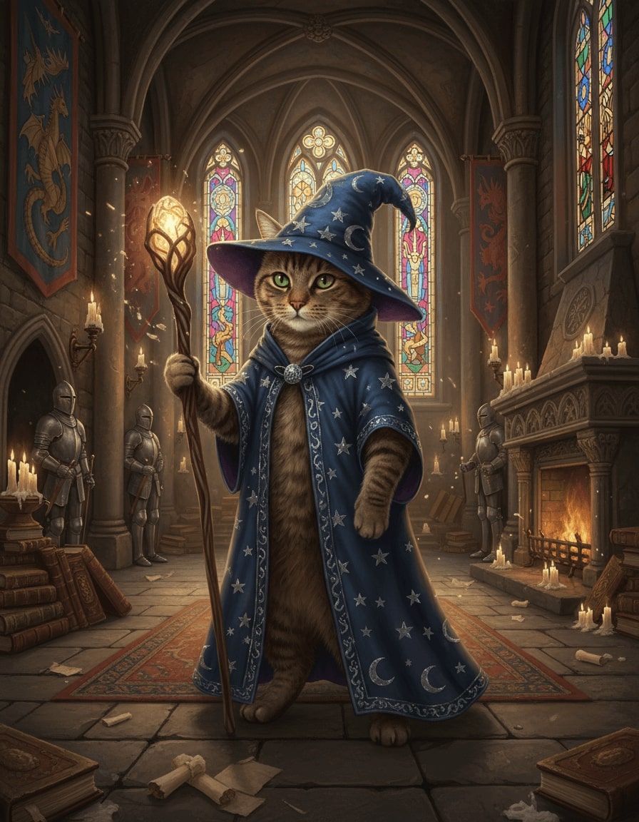 Prompt 1: Use the uploaded pet photo to turn the animal into a wizard with a magic staff, standing in a medieval castle hall, glowing candlelight, fantasy style.