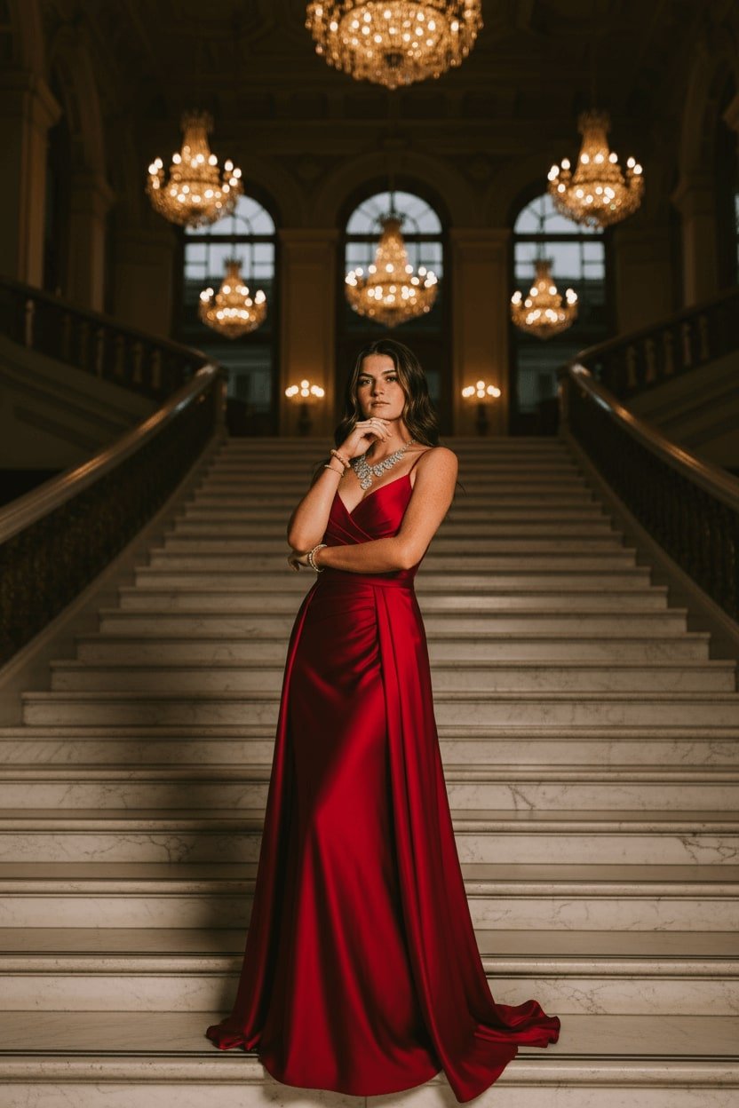 Prompt 1: Use the uploaded image to generate a model photo wearing a red evening gown and diamond necklace, standing on a marble staircase, hyper-realistic style, golden chandelier lighting.