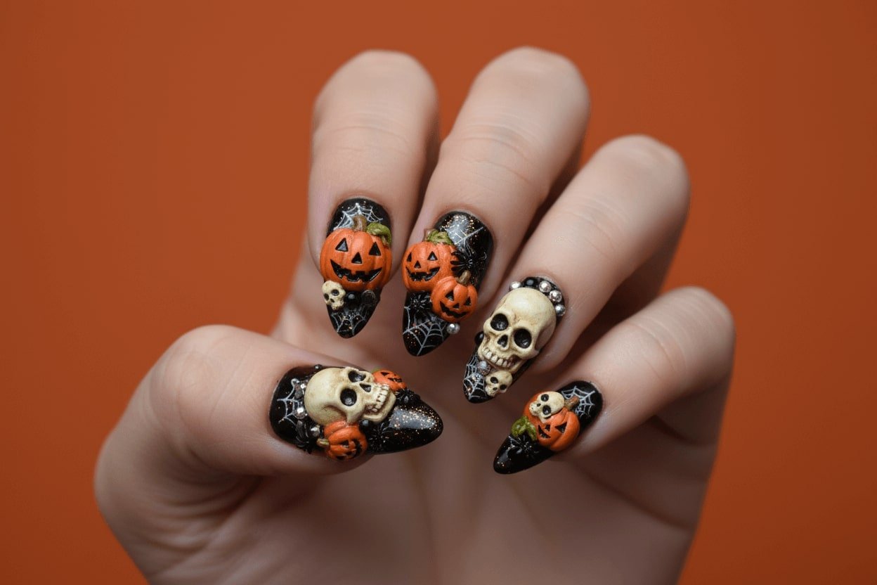 16. 3D Halloween manicure with mini pumpkins and skulls