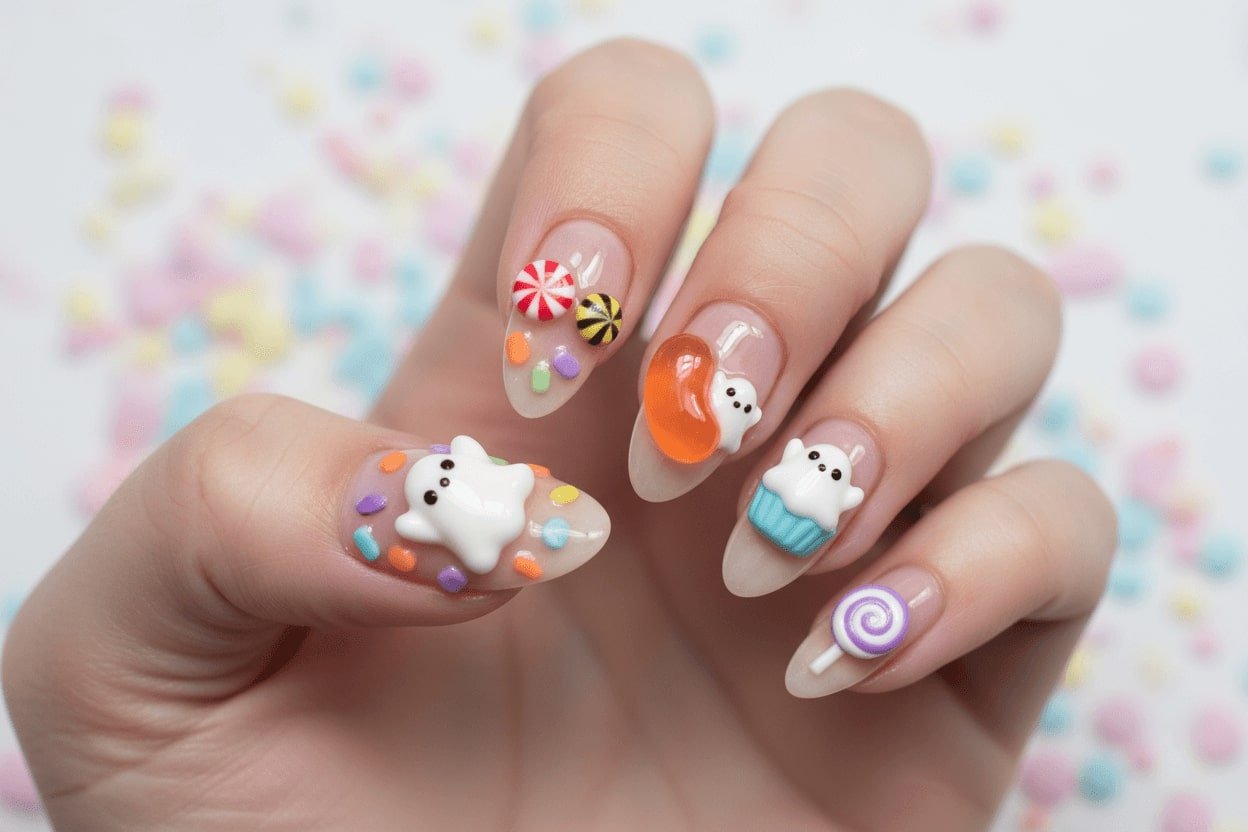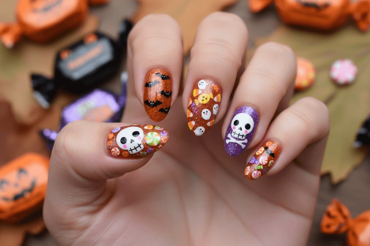 30. Cute Halloween nails with candy, bats, and smiling skulls
