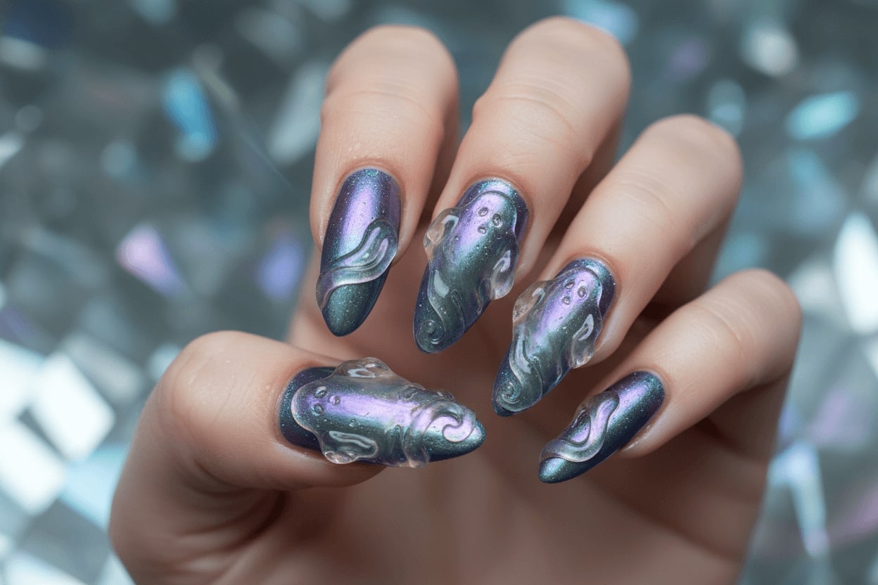 21. Aurora chrome nails with transparent ghost nail design