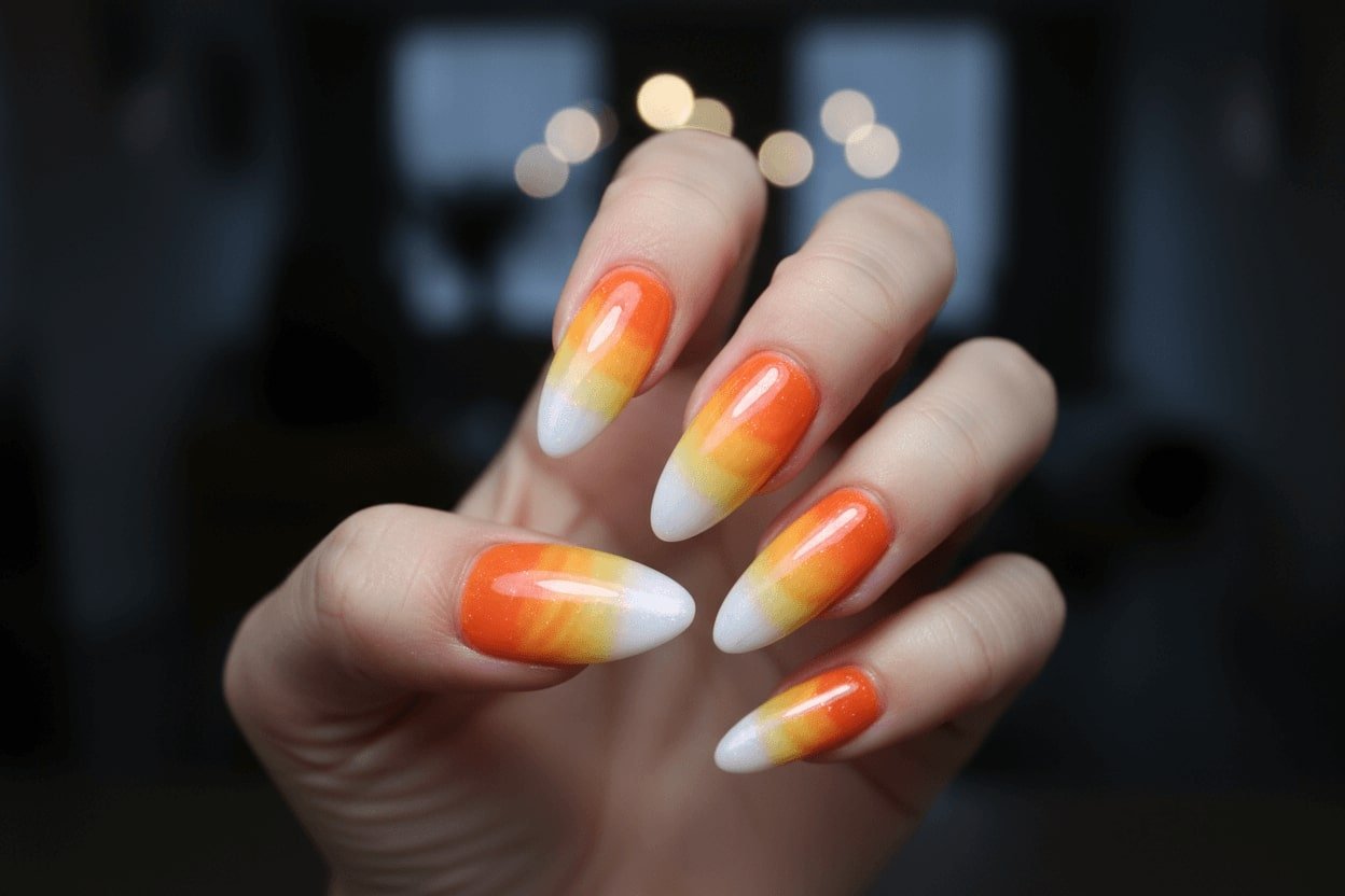 25. Aurora nails with candy corn colors and a glow effect