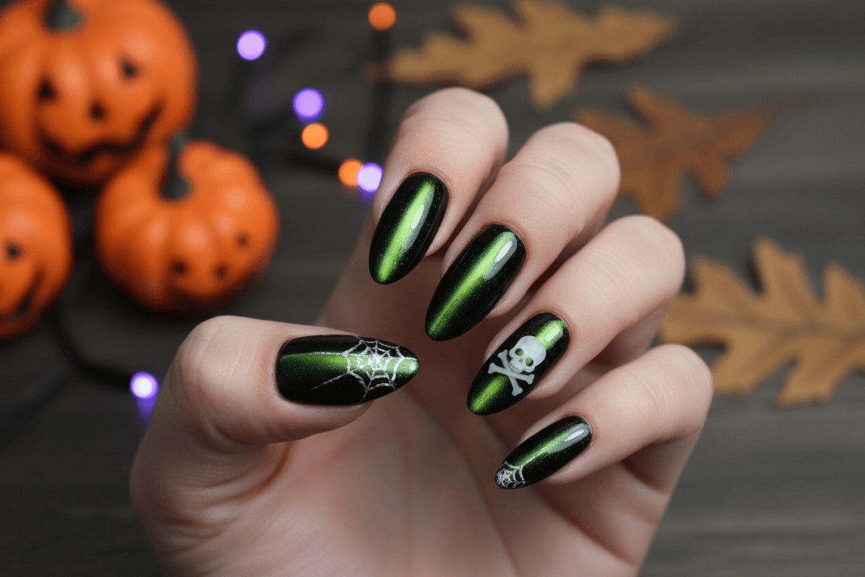 1. Black cat eye nails with subtle green shimmer, Halloween style