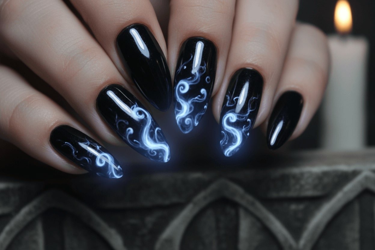 4. Black chrome nails with ghostly glow accents