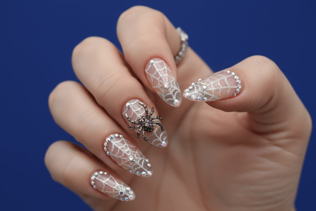 17. Crystal spider web nail design with rhinestone decorations