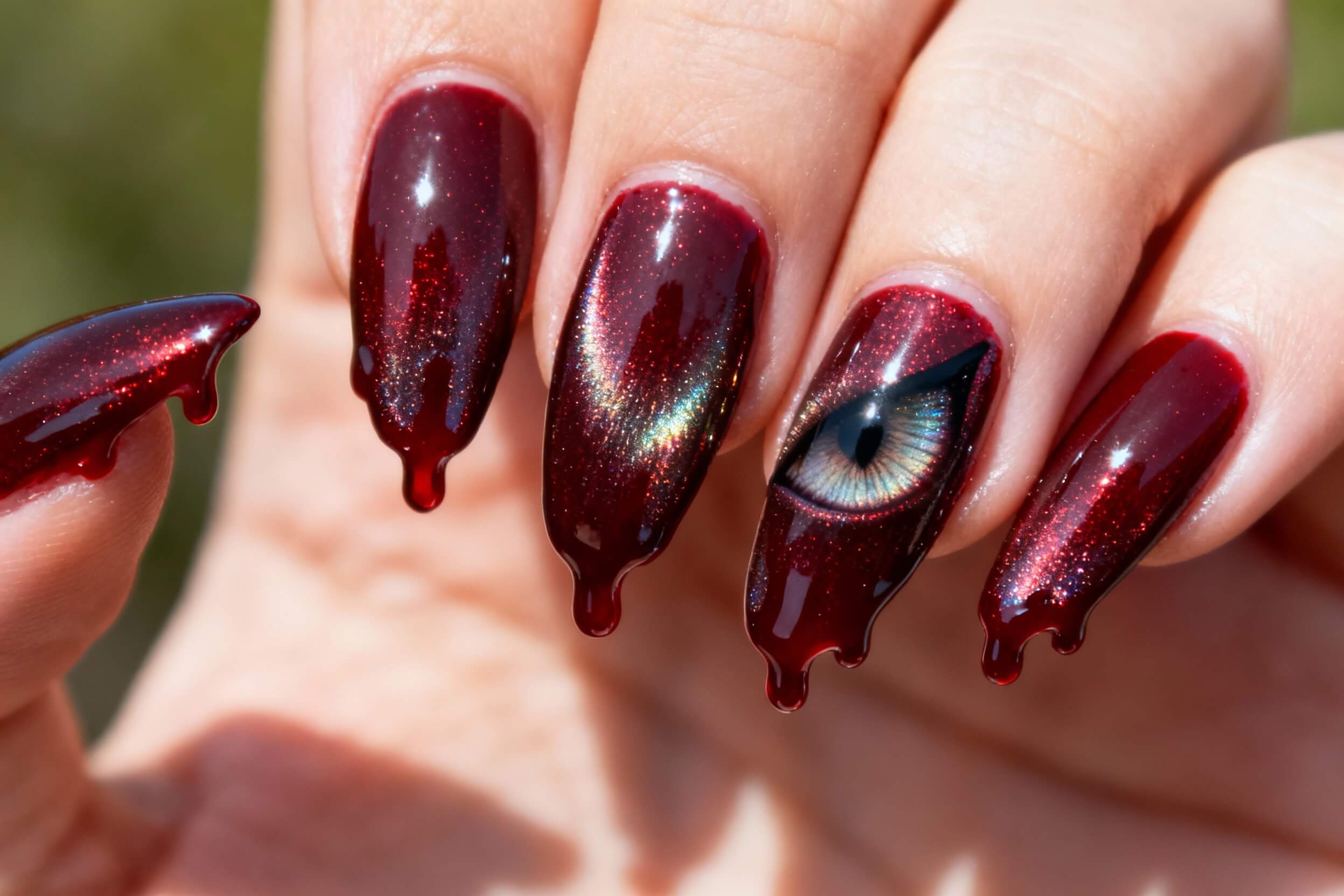 3. Dark red cat eye nails with blood drip effect