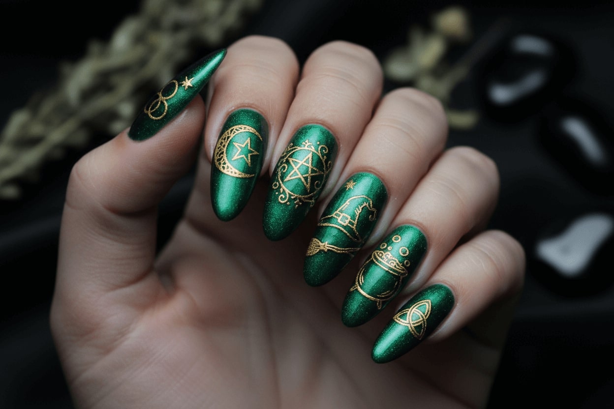 5. Emerald green cat eye nails with witch symbol details