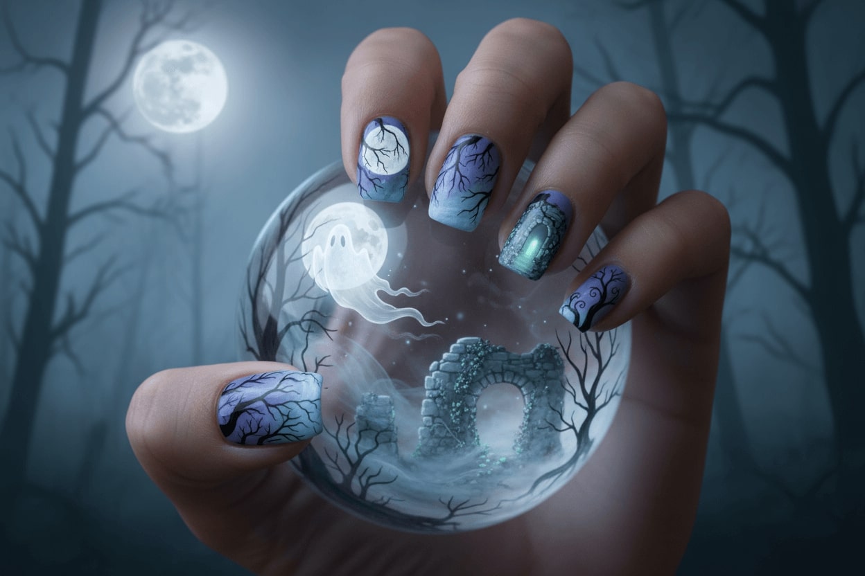 29. Ghostly forest scene nails with full moon illustration