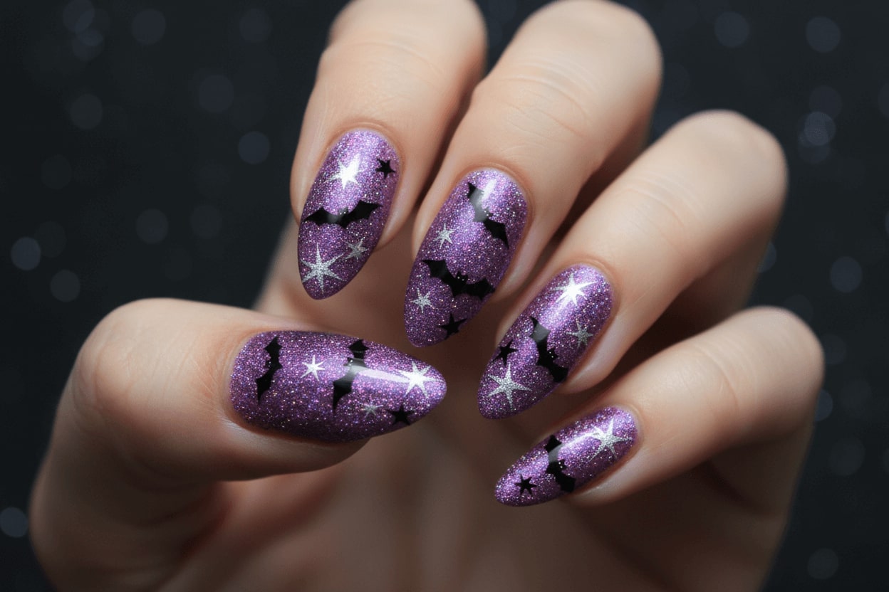 22. Glittery purple nails with bats and stars pattern