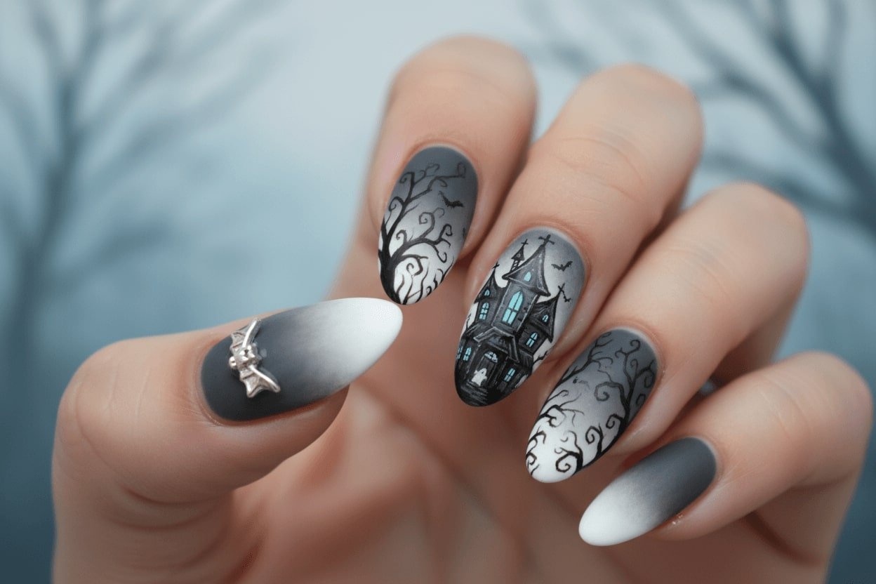 9. Grey to white fog gradient nails with haunted house art
