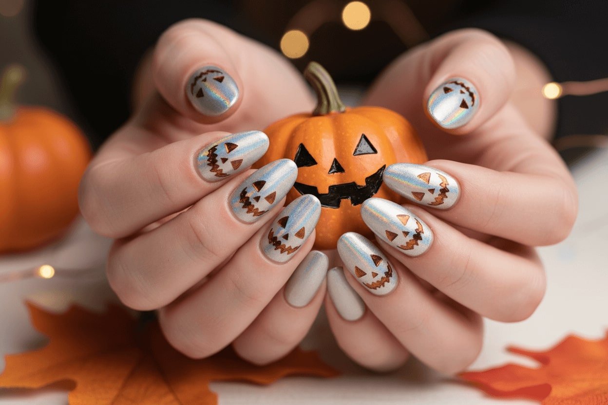 23. Holographic silver nails with pumpkin face engraving