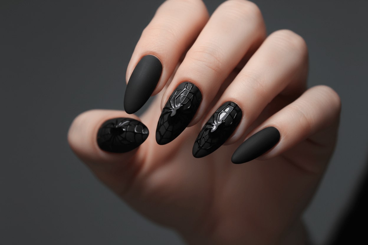11. Matte black nails with glossy spider web nail art
