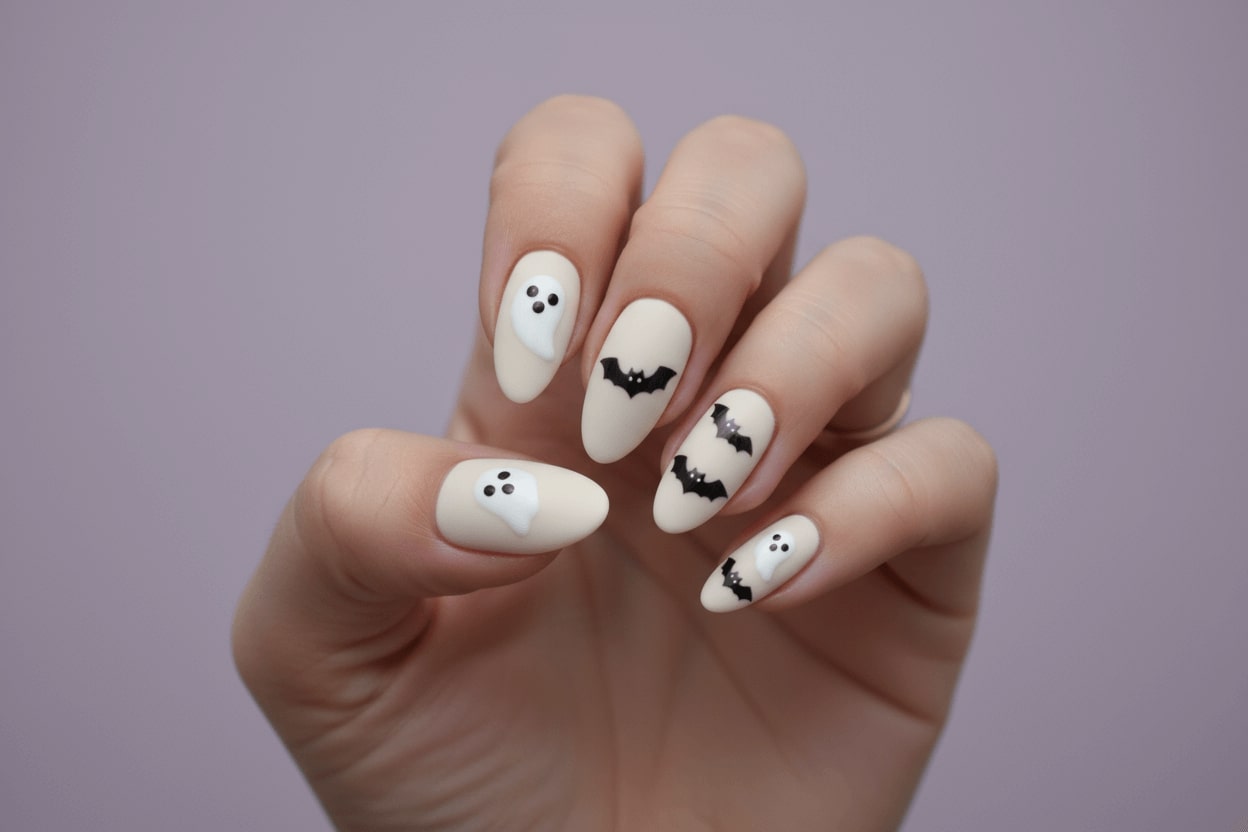 15. Matte nude nails with tiny ghost and bat stickers