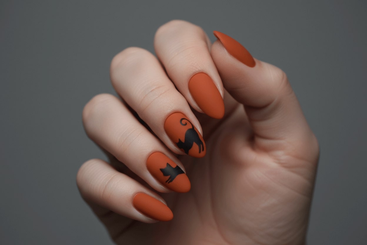 13. Matte pumpkin nail art with black cat design