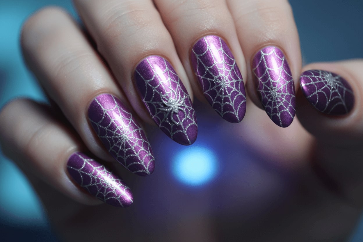 2. Purple metallic nails with silver spider web nail design