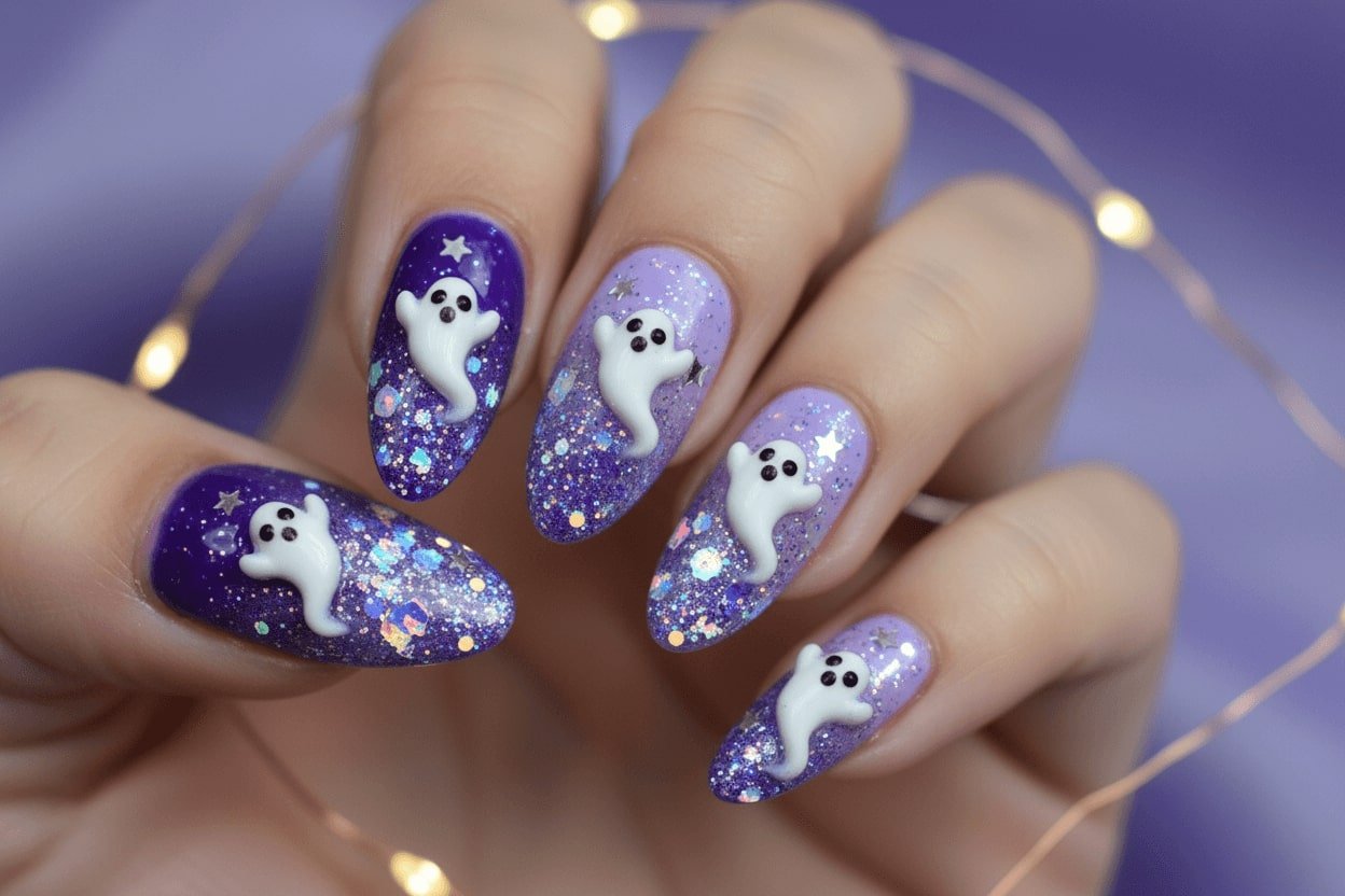 7. Purple ombre nails with glitter and tiny ghosts