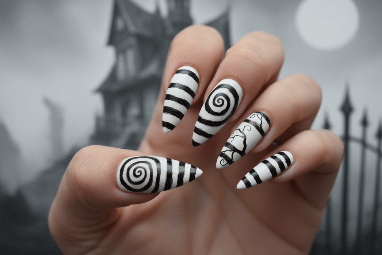 27. Tim Burton style black-and-white striped nails