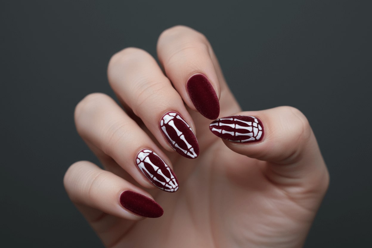 14. Velvet burgundy nails with skeleton hand prints