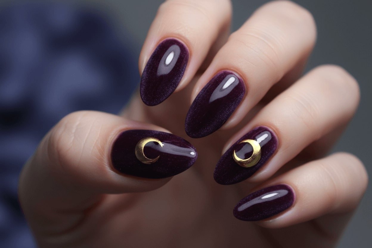 12. Velvet deep purple nails with golden crescent moons