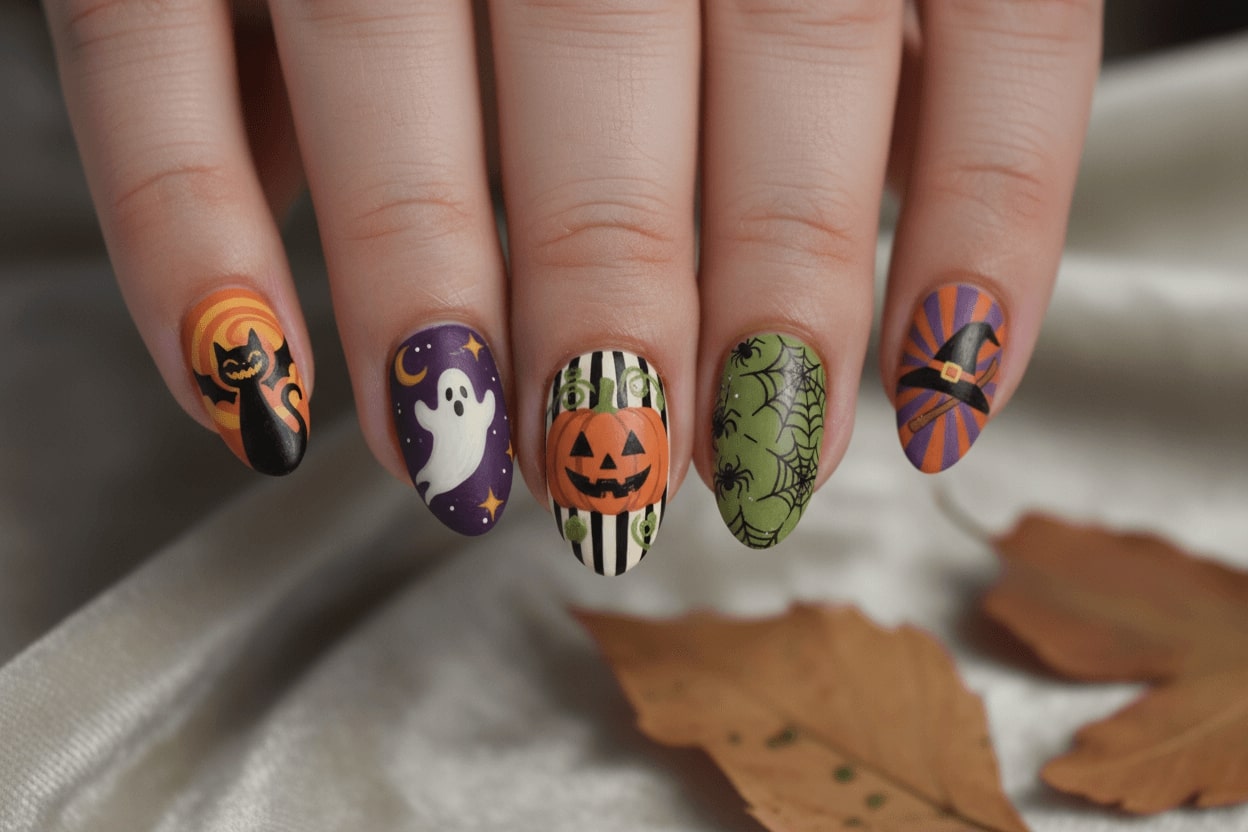 28. Vintage Halloween manicure art with retro colors
