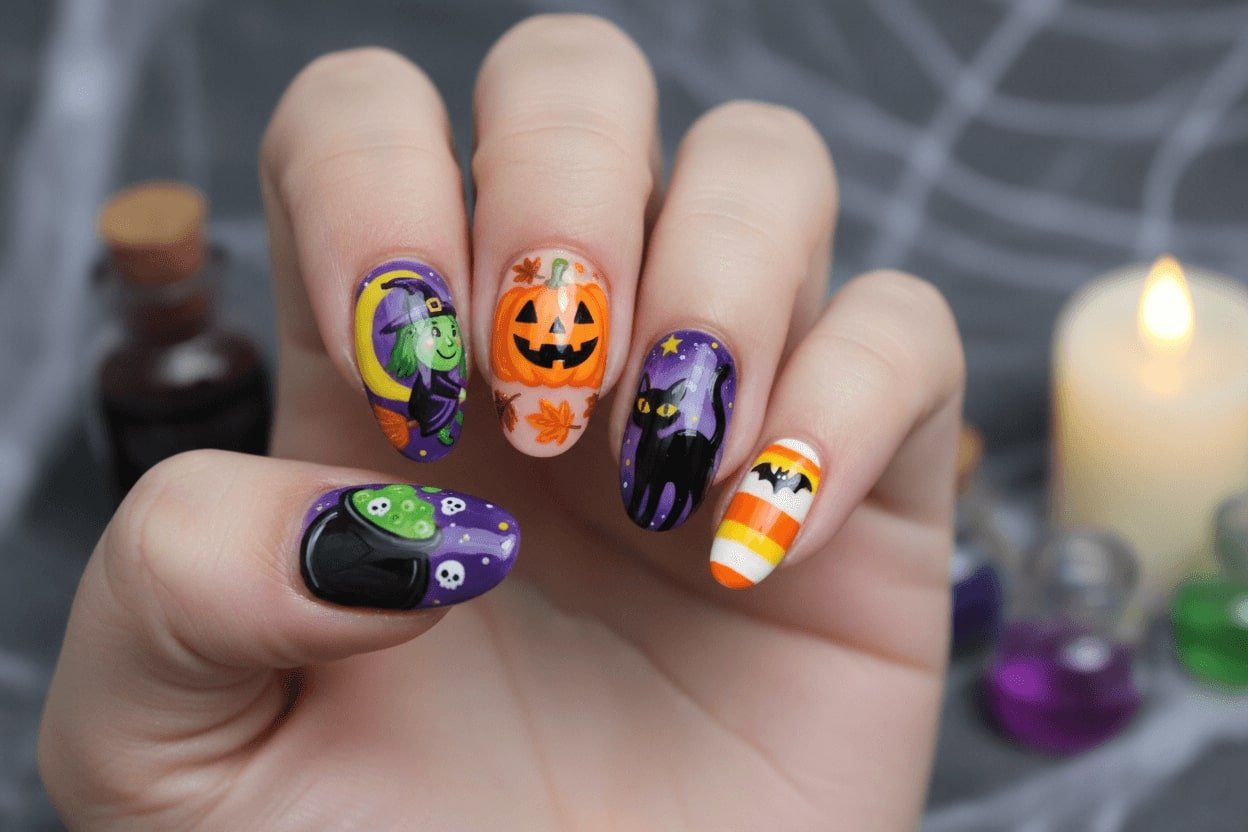 26. Cartoon Halloween nails with witch, pumpkin, and cat