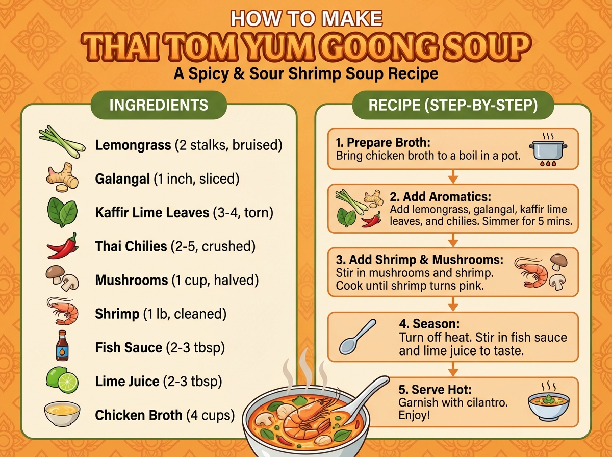 Create an infographic that shows how to make Thai Tom Yum Goong Soup, with ingredients and recipe in it.
