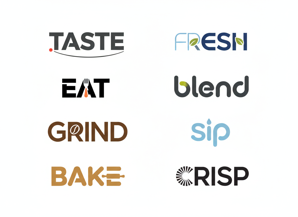 Turn these 8 Logos into sophisticated minimalistic logos to make letters from realistic food to express the meaning of this word. Composition: rendering of all logos on a single solid white background.
