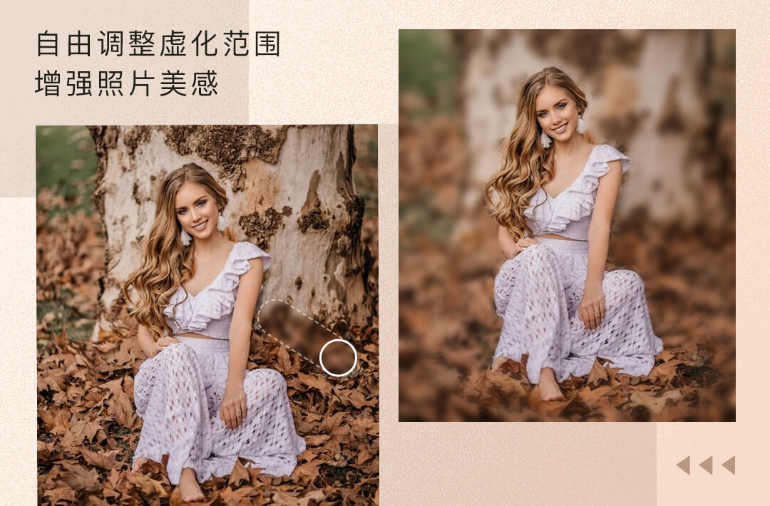 没有专业的摄影设备,如何拍出单反质感的照片?试试Fotor背景虚化工具,1分钟赋予照片单反虚化质感!Fotor为你提供了移轴虚化、笔刷虚化两种工具,只需轻点鼠标,即可自由调整虚化形状和范围,弱化背景杂质干扰,让视线集中于照片焦点。现在就上传照片,应用虚化功能提升质感吧!