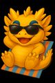 A relaxed yellow dragon with black sunglasses lounges on a striped beach towel, one hand behind its head and the other resting casually. A small drink with a straw gently appears in its right hand. In the background, a warm sun rises slowly, casting soft light across the scene. The dragon gives a lazy thumbs-up with its left hand. The moment freezes mid-relaxation, radiating sunny, carefree vibes.