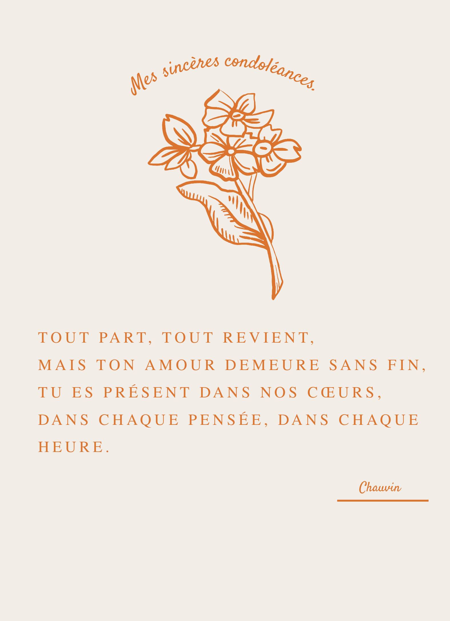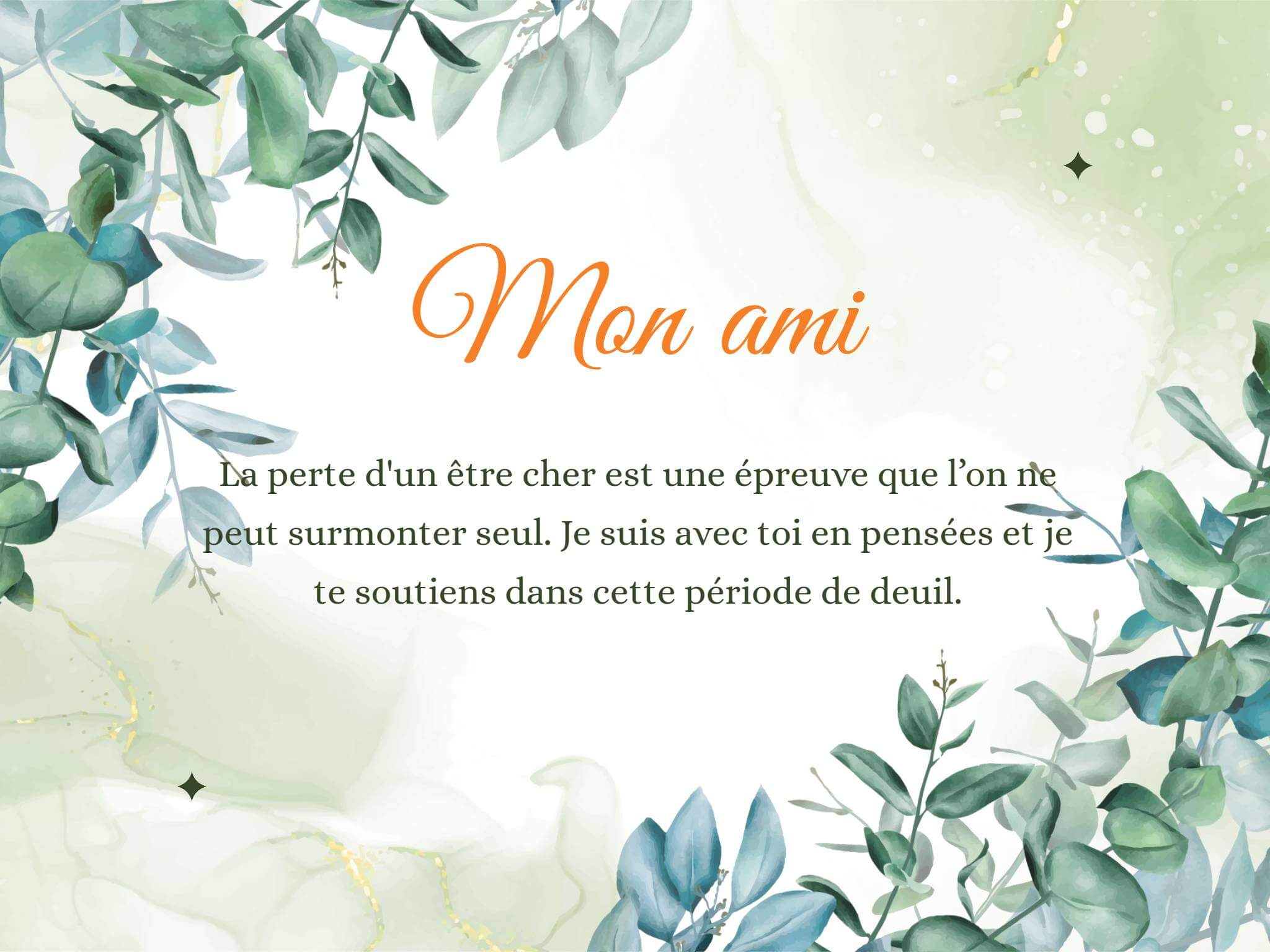 Des expressions comme « sincères condoléances », « pensées affectueuses », ou « tout mon soutien dans cette épreuve » sont largement utilisées dans les formules de condoléances.