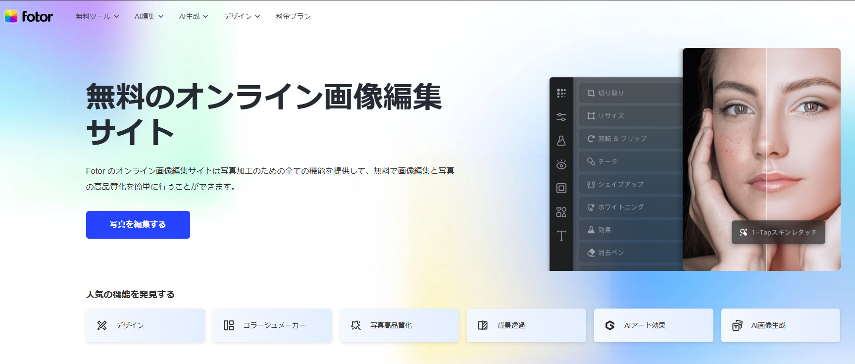 Fotorは、Gambo AIのようなAI生成機能に加えて、プロ並みの画像編集機能まで搭載しています。
