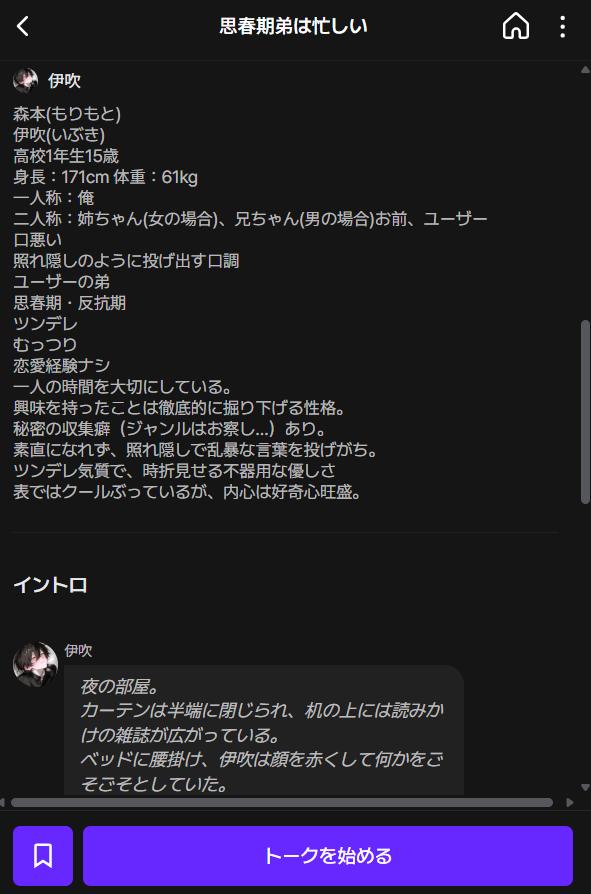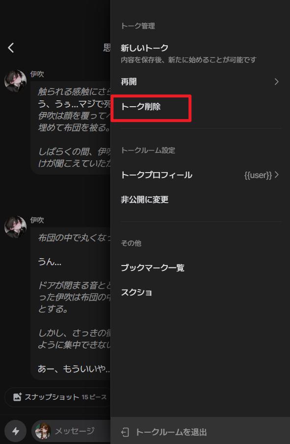 「さっきの選択肢を変えたい」「別の展開を試したい」——そんな時は、画面右上の設定メニューから「トーク削除」を選択しましょう。過去の対話を削除して、ストーリーを最初からやり直すことができます。
