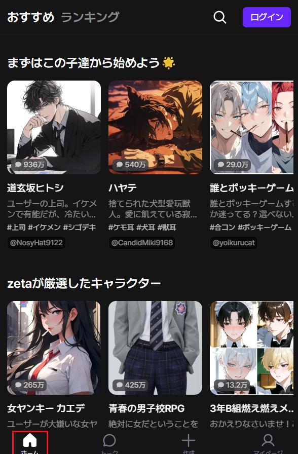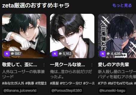 自分で作るのが面倒な方や、すぐに始めたい方には、Zeta AI厳選のキャラクターや他のユーザーが作成したキャラクター、公式提供のキャラクターから選ぶ方法がおすすめです。