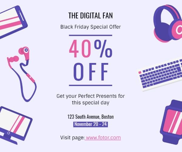このブラックフライデー電気製品特別セールFacebook投稿のテンプレートはFotorのプログラフィックデザイナーによって作成されました。ドラッグ&ドロップの編集ツールを使って、テキストや画像などを思い通りに変更できます。デザインのスキルは必要ありません。ブラウザ上で素敵なデザインを作成できます。