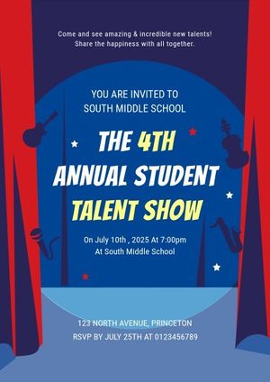 This Annual Student Talent Show Invitation Template Invitationtemplate is created by the talented graphic designers at Fotor. Click “Use this template”to start editing online. Change the text, images and more the exact way you wish using drag-and-drop editing tools. No design skills required with Fotor. Create stunning designs right in your web browser.