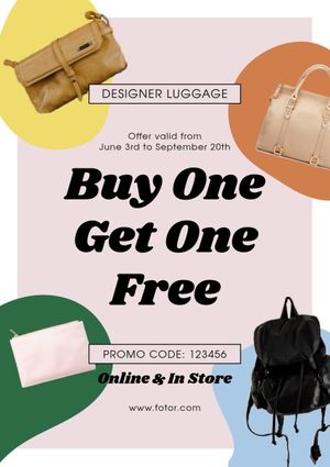 This Buy One Get One Free Fashion Bag Sale Poster Template Postertemplate is created by the talented graphic designers at Fotor. Click “Use this template”to start editing online. Change the text, images and more the exact way you wish using drag-and-drop editing tools. No design skills required with Fotor. Create stunning designs right in your web browser.