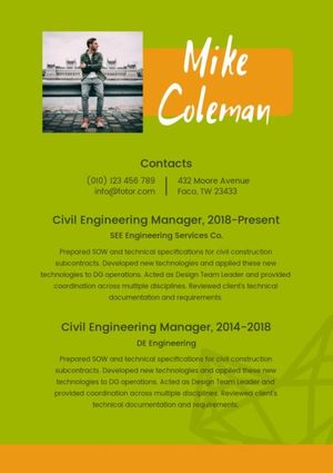 This Civil Engineering Manager Green Art Resume Template Resumetemplate is created by the talented graphic designers at Fotor. Click “Use this template”to start editing online. Change the text, images and more the exact way you wish using drag-and-drop editing tools. No design skills required with Fotor. Create stunning designs right in your web browser.