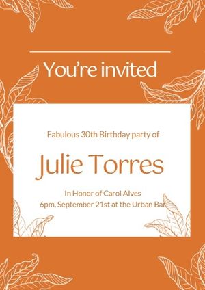 This Floral Thirty Years Old Birthday Invitation Template Invitationtemplate is created by the talented graphic designers at Fotor. Click “Use this template”to start editing online. Change the text, images and more the exact way you wish using drag-and-drop editing tools. No design skills required with Fotor. Create stunning designs right in your web browser.