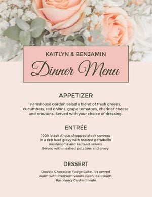 This Rose Flower Wedding Menu Template Menutemplate is created by the talented graphic designers at Fotor. Click “Use this template”to start editing online. Change the text, images and more the exact way you wish using drag-and-drop editing tools. No design skills required with Fotor. Create stunning designs right in your web browser.