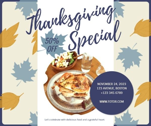 This Thanksgiving Restaurant Special Sale Facebook Post Template Facebook Posttemplate is created by the talented graphic designers at Fotor. Click “Use this template”to start editing online. Change the text, images and more the exact way you wish using drag-and-drop editing tools. No design skills required with Fotor. Create stunning designs right in your web browser....Unfold